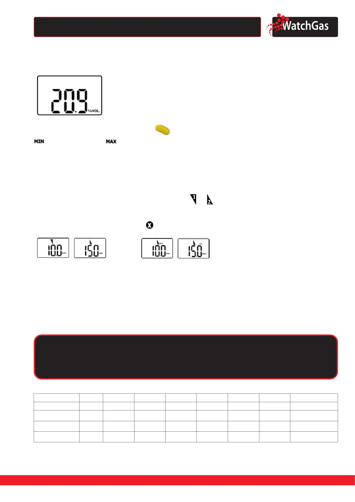 Low alarm 19% 25 ppm 5 ppm 100 ppm 1 ppm 1.5 ppm 20 ppm 5 ppm