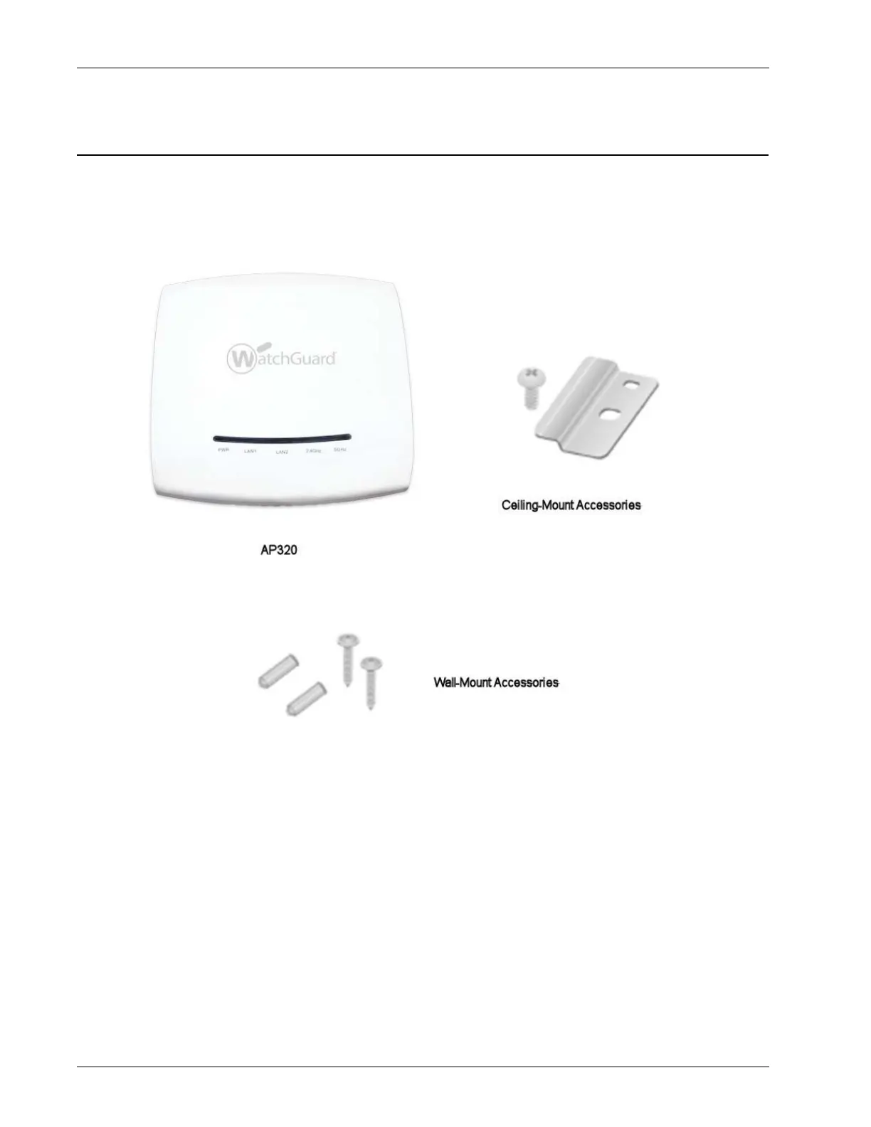 Your package includes the AP320 device, and wall-mount and T-rail ceiling-mount accessories.