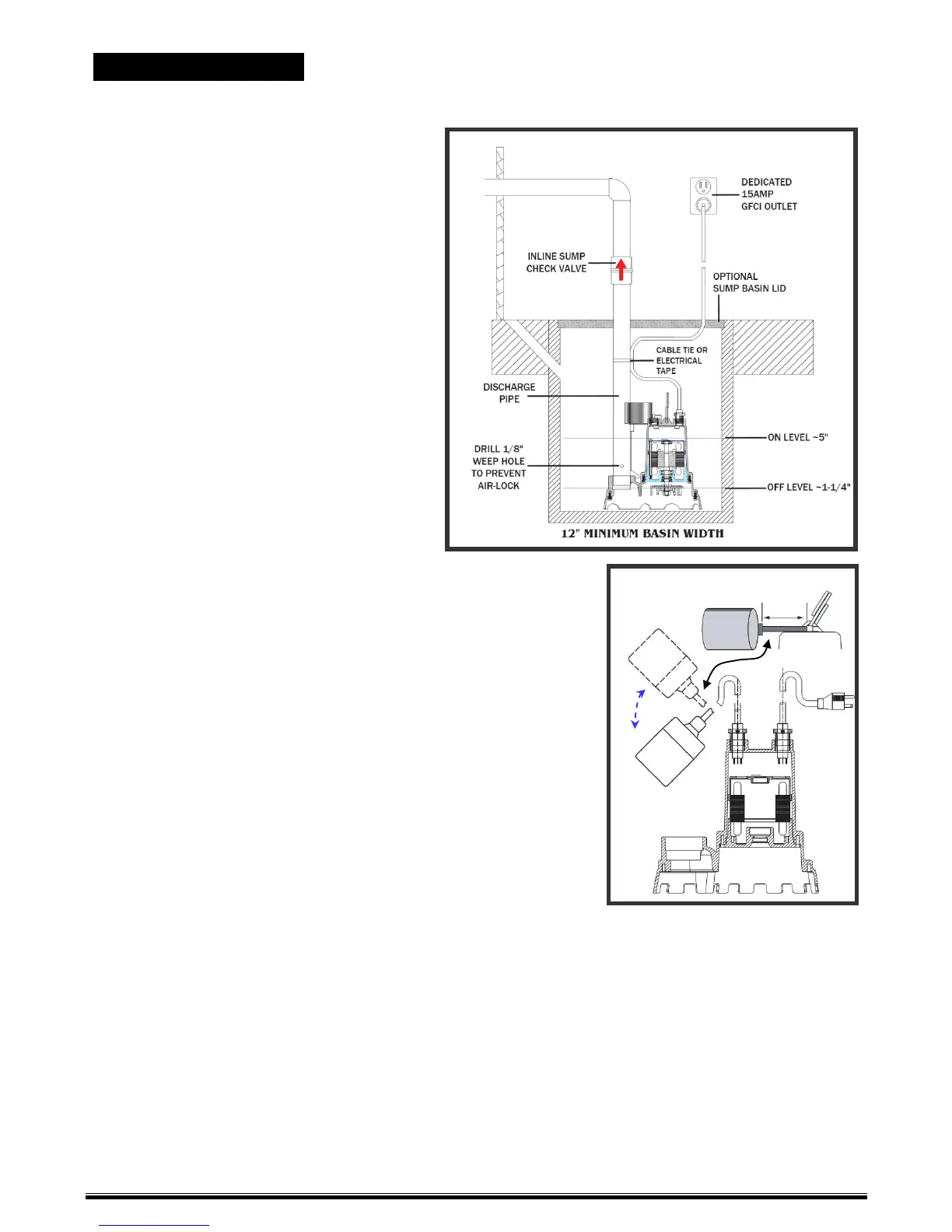 11. To test your installation, fill the sump pit with water using buckets or a hose. When the float switch