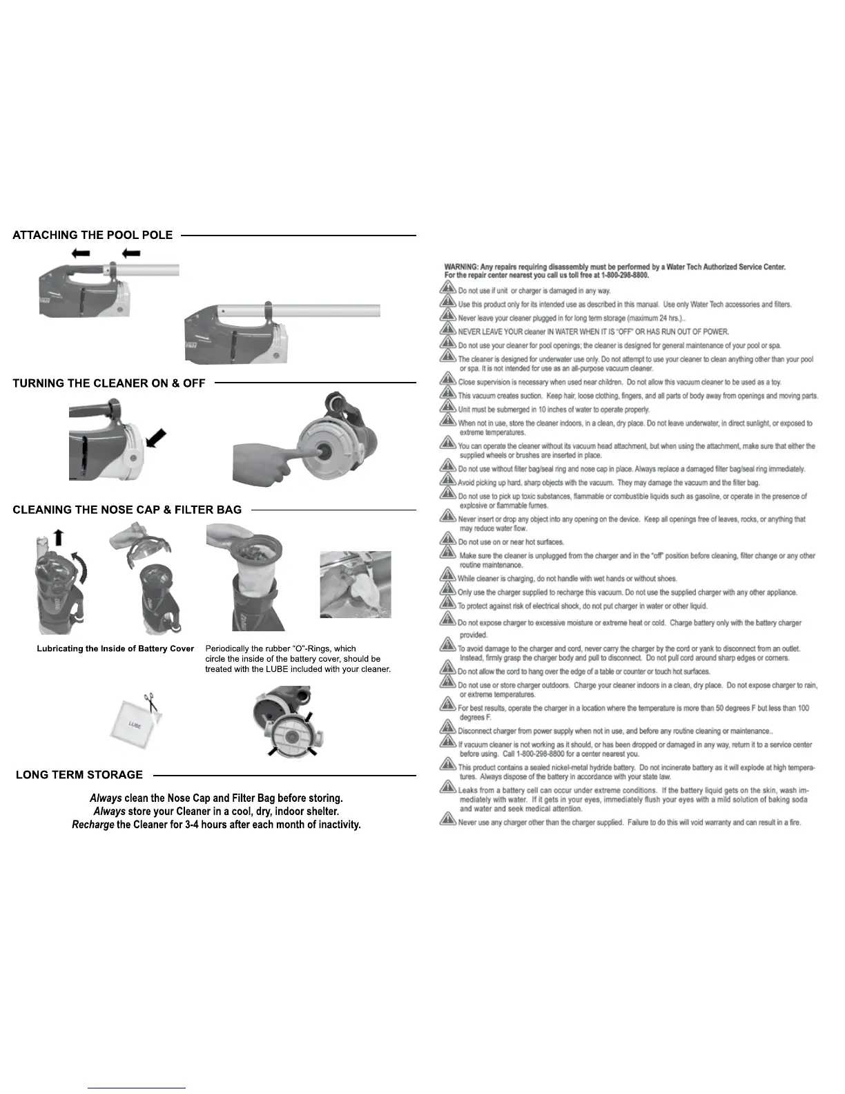 Water Tech Pool Blaster CATFISH Ultra - Attaching the Pool Pole; Turning the Cleaner On & Off; Cleaning the Nose Cap & Filter Bag; Lubricating the Inside of Battery Cover