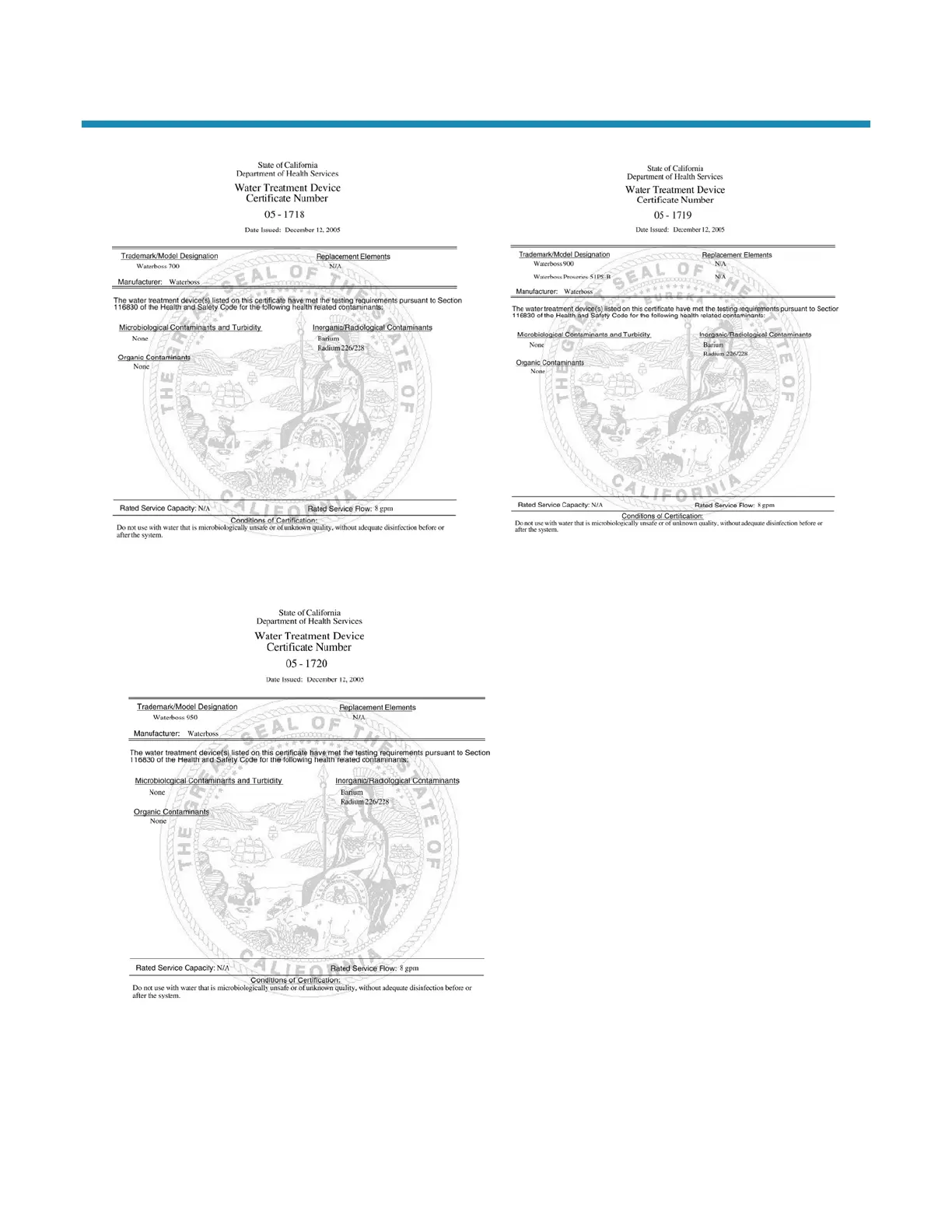 WaterBoss 950 - Certificates; California Health Services Certification