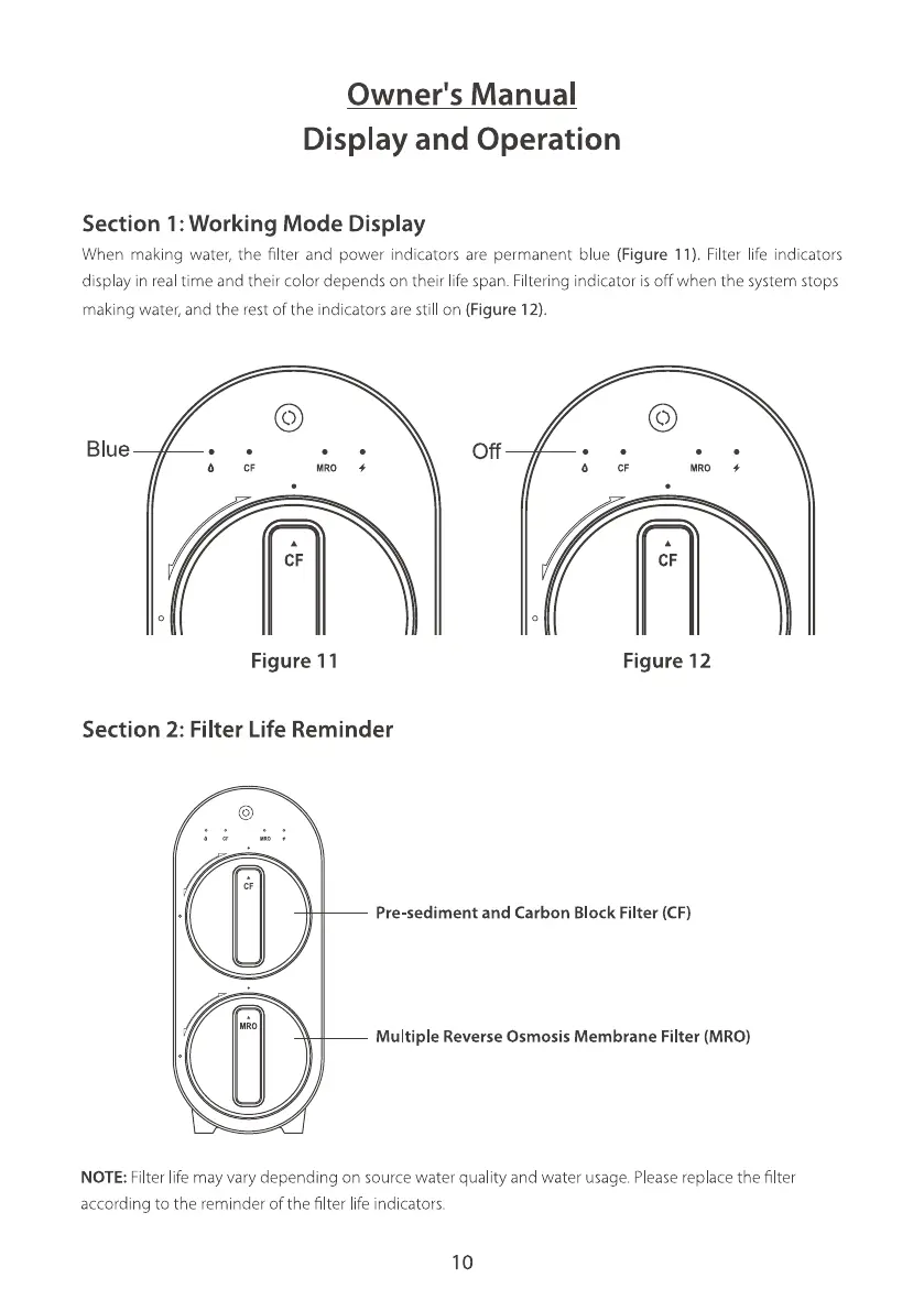 When making water, the filter and power indicators are permanent blue (Figure 11). Fiter life indicators