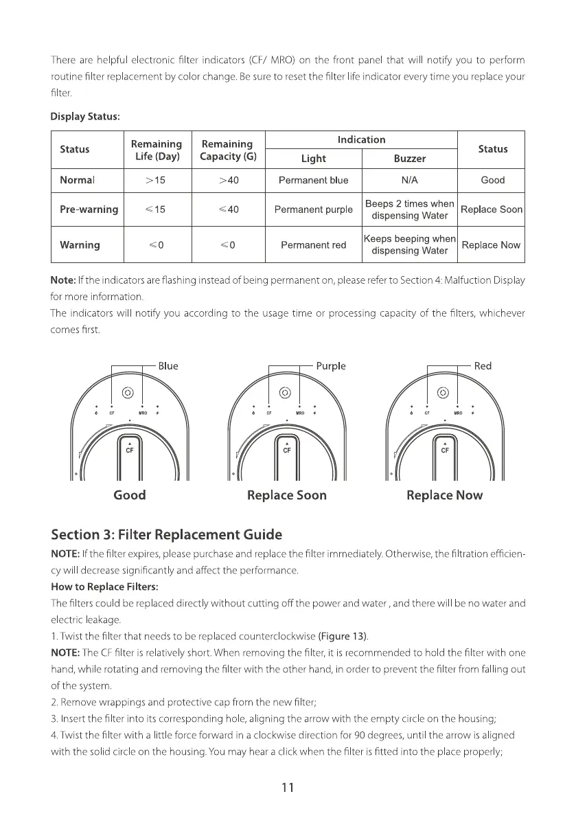 There are helpful electronic filter indicators (CF/ MRO)on the front panel that will notify you to perform