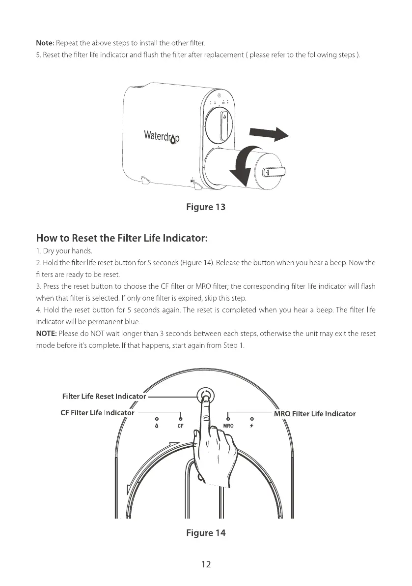 2. Hold the filter life reset button for 5 seconds (Figure 14).Releasethe button when you hear a beep. Now the
