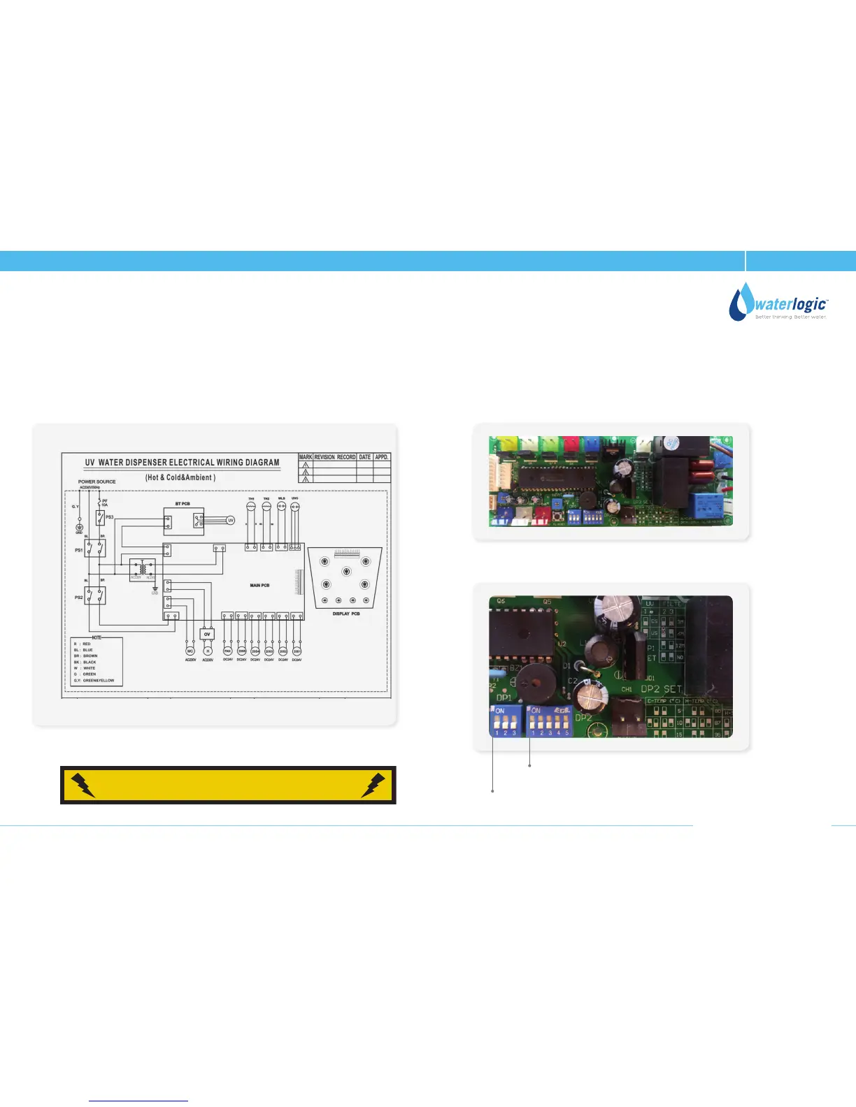WaterLogic WL Cube Firewall - Electrical Wiring Diagram 230 V; 230 V Diagram Safety Warning; Dip Switch Setup; Main PCB and Switch Overview