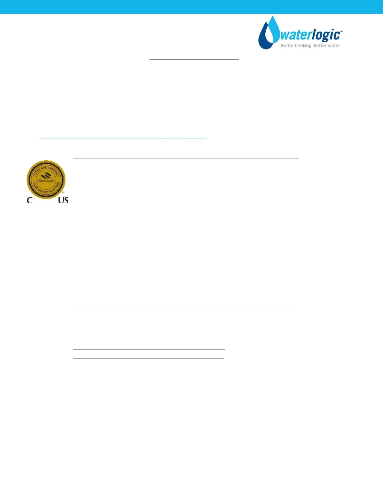 WL2FLT Water Treatment System Certifications Include: