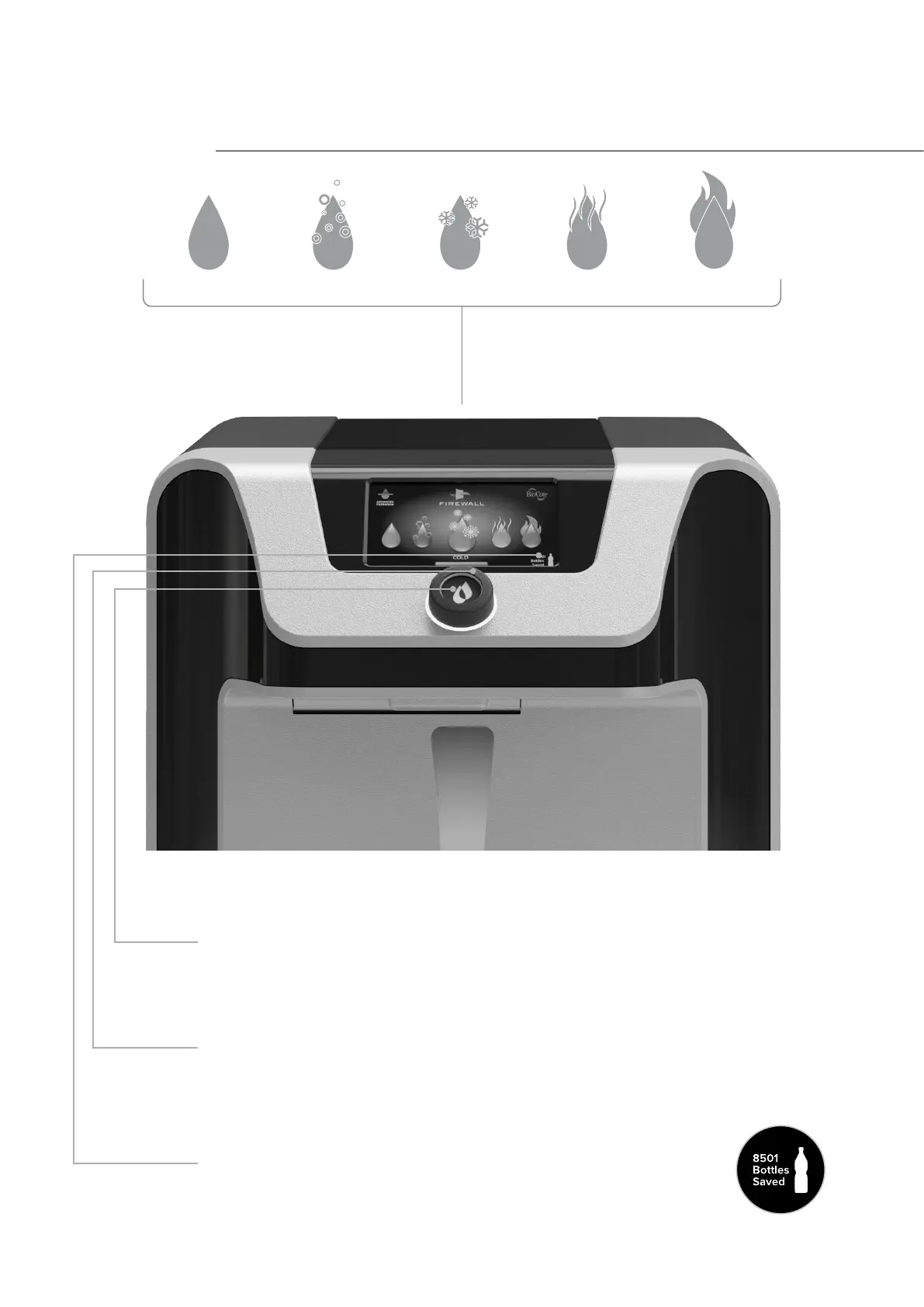 WaterLogic WL7 FIREWALL - User Interface; Rotating Intuitive Dial; Dispense Status Bar; Bottles Saver Counter
