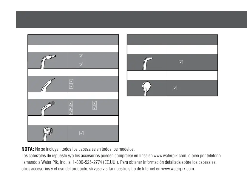 llamando a Water Pik, Inc., al 1-800-525-2774 (EE.UU.). Para obtener información detallada sobre los cabezales,