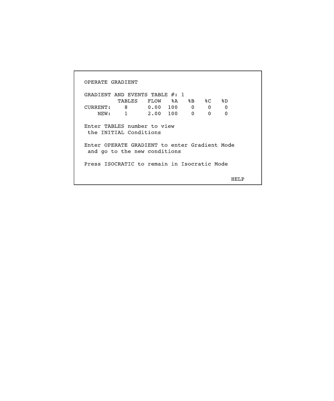 • Gradient and events table numbers (sets) to be run from the Operate Gradient screen
