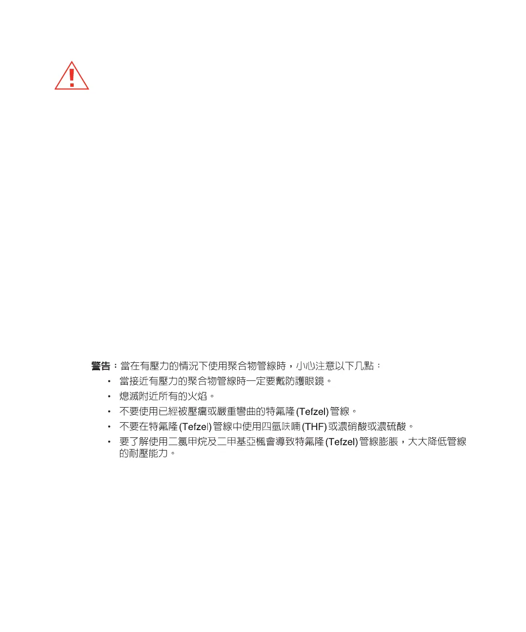 • Non utilizzare tubi Tefzel contenenti tetraidrofurano (THF) o acido solforico o nitrico