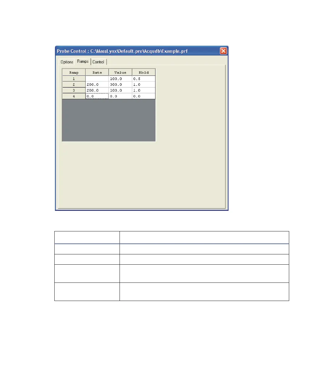 Probe Control dialog box’s Ramps tab parameters