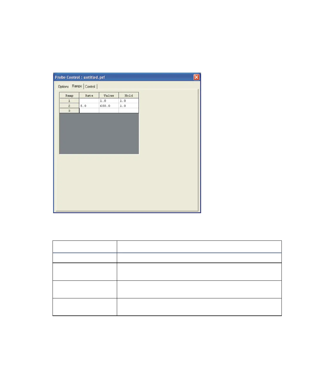 Probe Control dialog box Ramps tab: