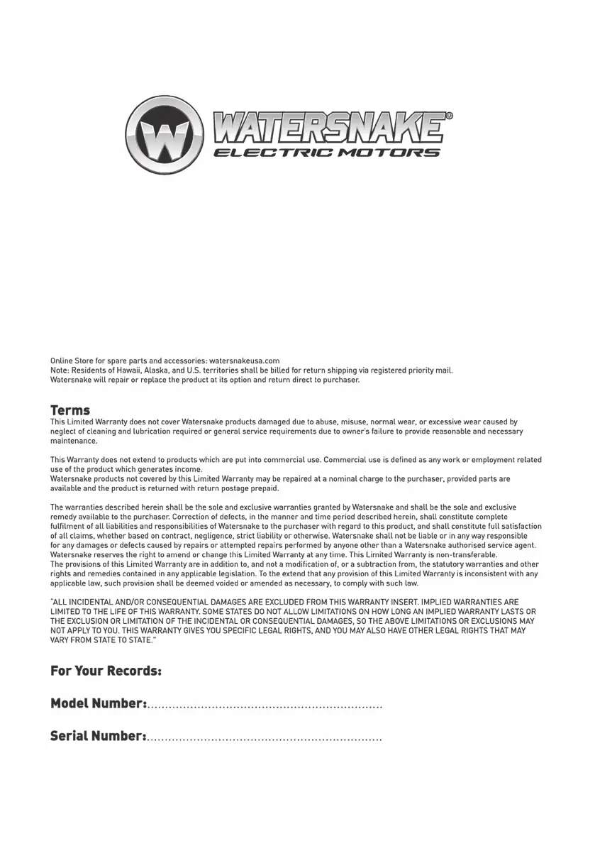 All watersnake products are covered by a one year Limited Warranty covering faults in