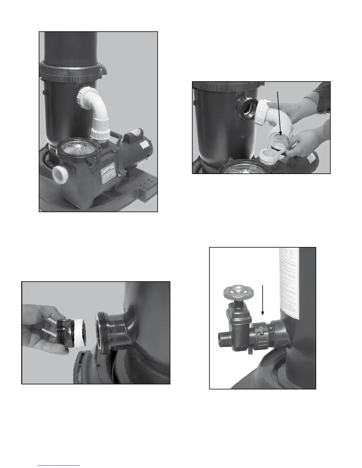 end of elbow assembly and attach to discharge on pump. Insert