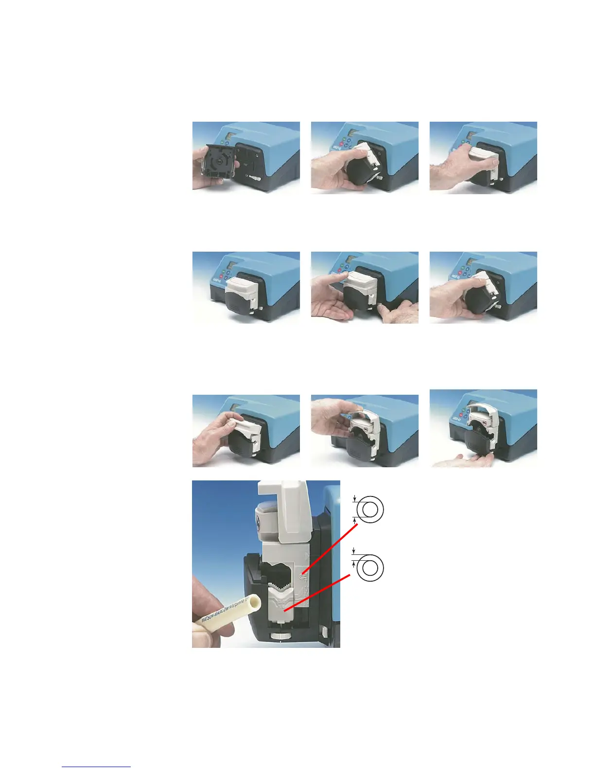 Switch off the pump before tube loading. Lift the “flip top” track until fully open.