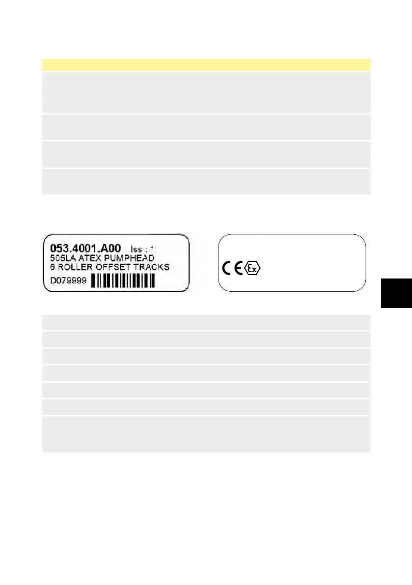 505LA 펌프헤드에는 다음의 라벨이 표시되어 있습니다: