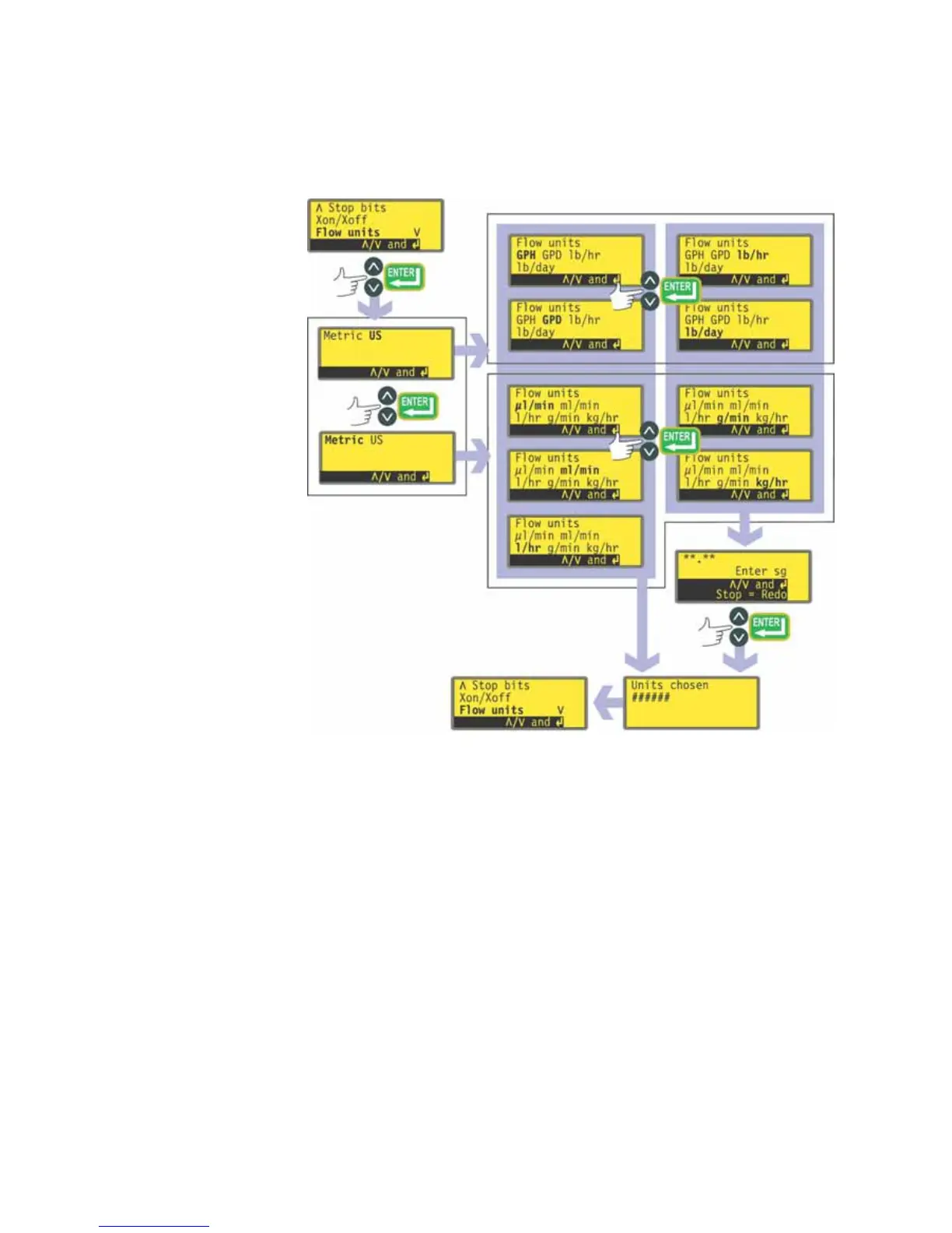 g/min or kg/hr. Use the UP and DOWN keys to choose and press ENTER to