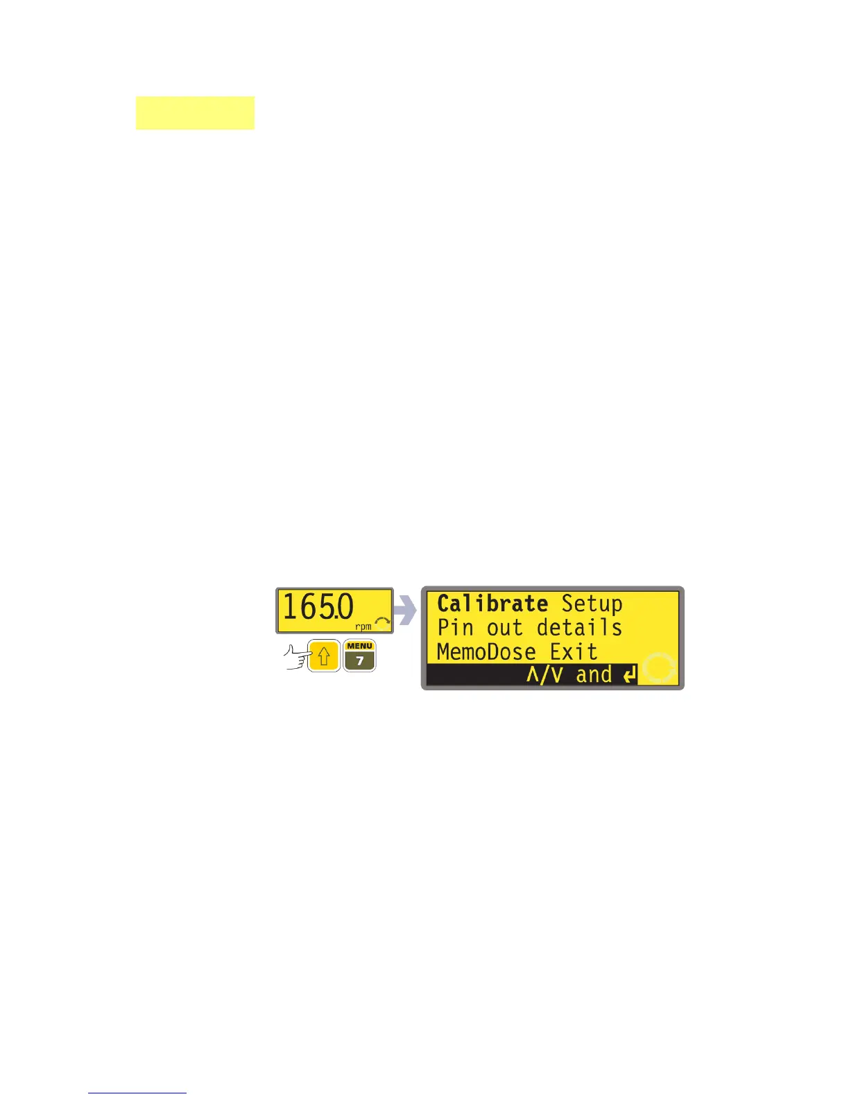 The main menu offers five options: Calibrate, Setup, Pin out details, MemoDose