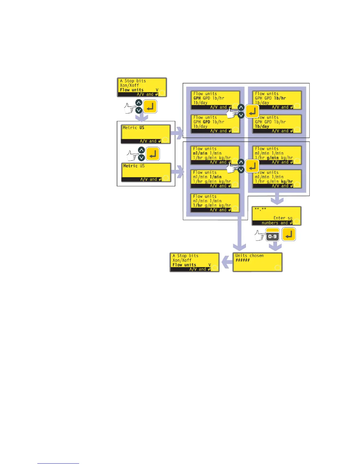 g/min or kg/hr. Use the UP and DOWN keys to choose and press ENTER to