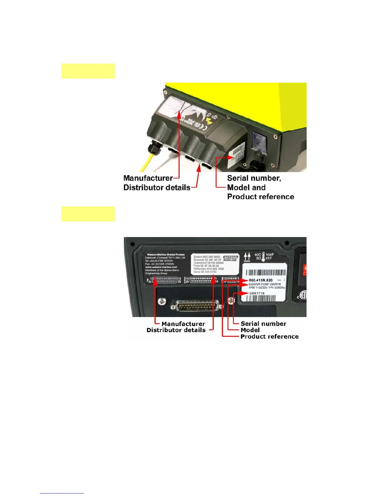 Labels fixed to the rear of the pump contain manufacturer and contact details, prod-