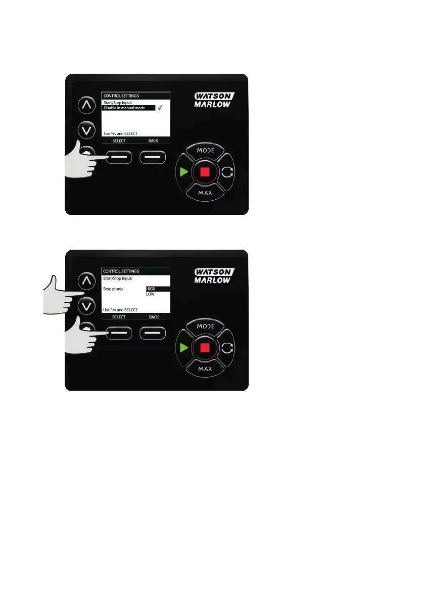The setting isü. The start/stop input is disabled. Press SELECT to open the logic state menu.