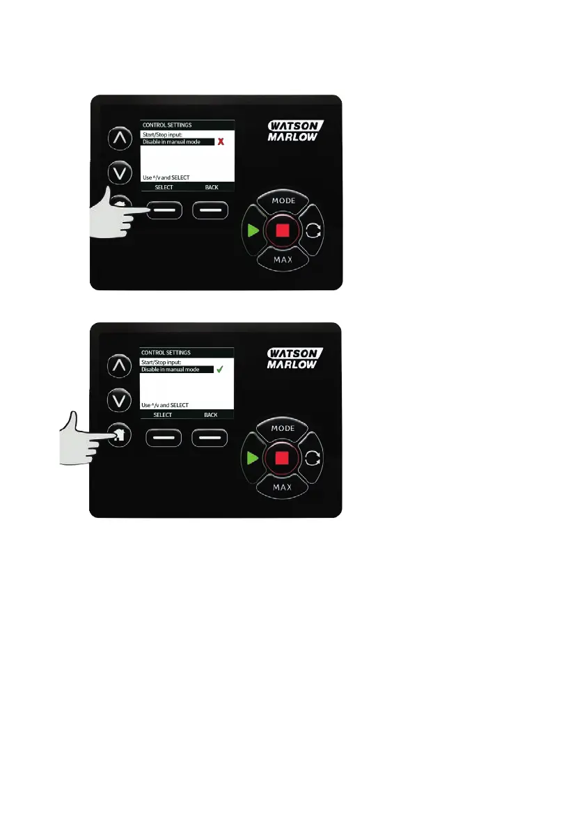 The default is û. The start/stop input is not disabled in manual mode. Press SELECT to change the setting