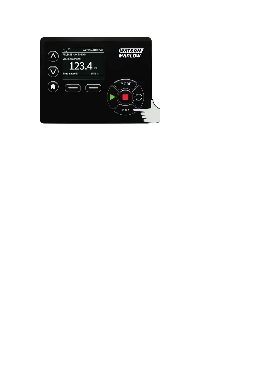The volume dispensed and time elapsed are displayed while the MAX key is pressed and held.