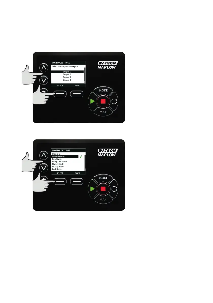 Use the / keys and press SELECT to choose which pump status you require for the chosen output.
