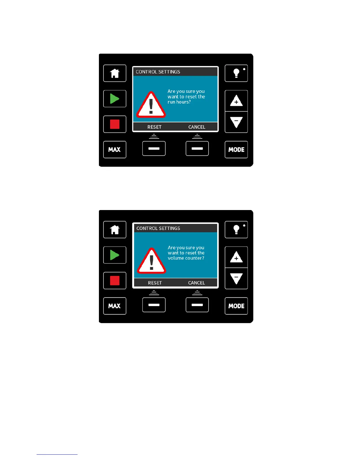 Select RESET to zero the run hours counter. The run hours counter can be viewed by