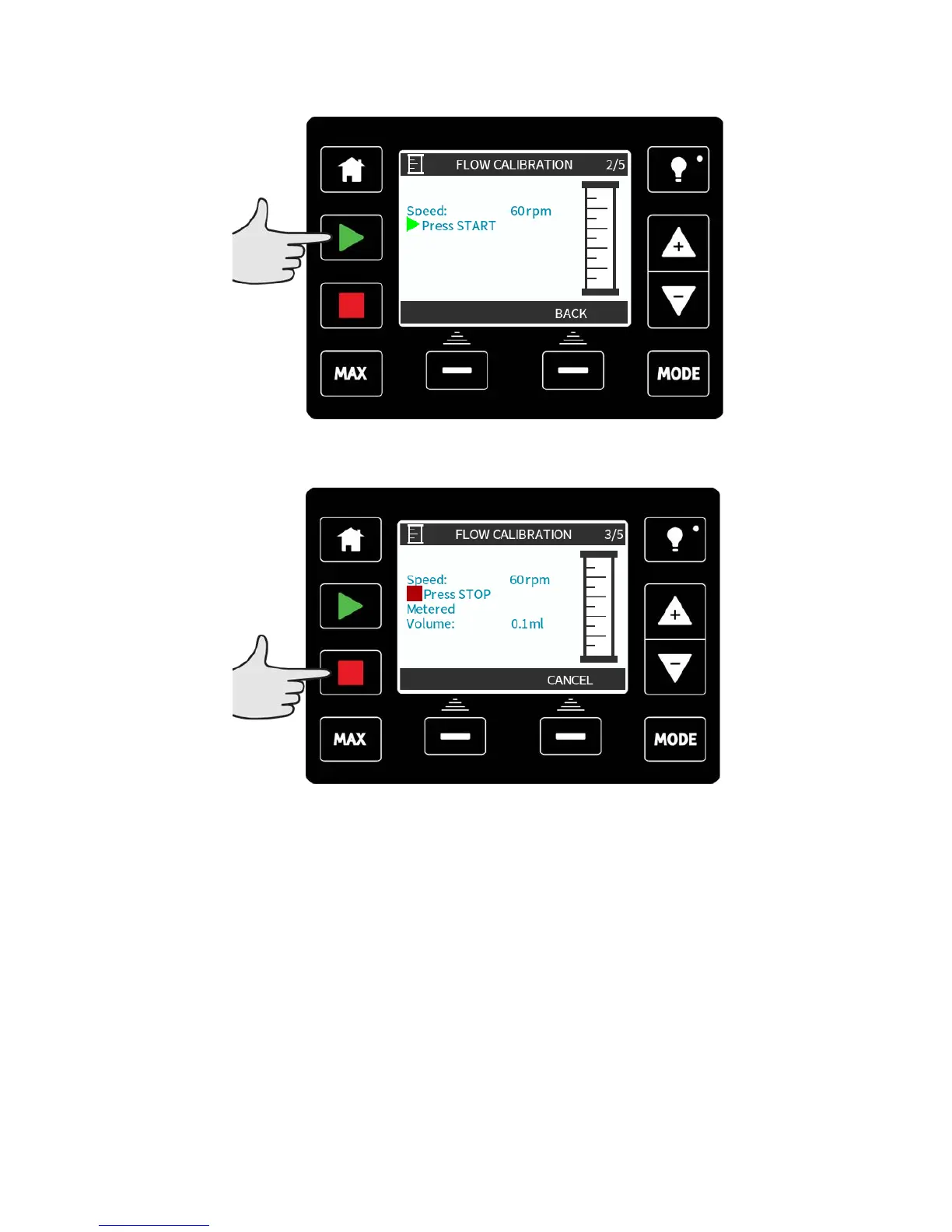 Press START to begin pumping a volume of fluid for calibration.