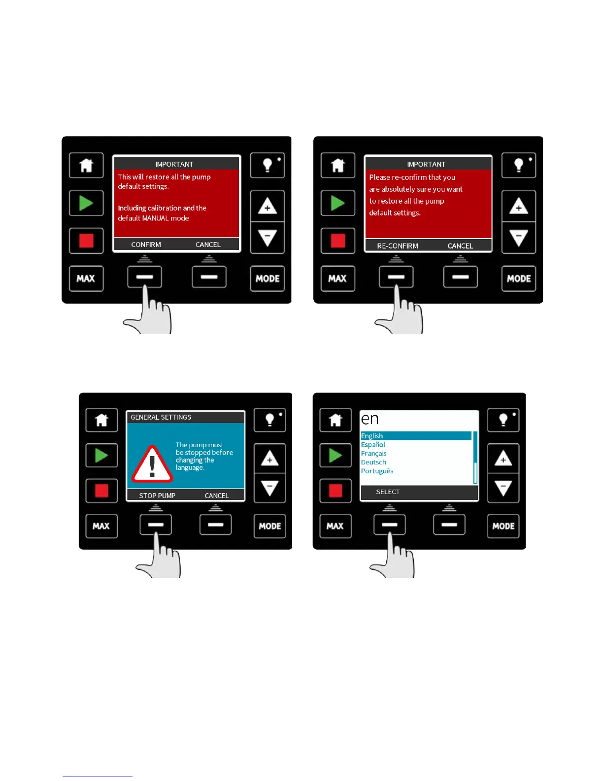 for the pump. The pump must be stopped before changing the language.