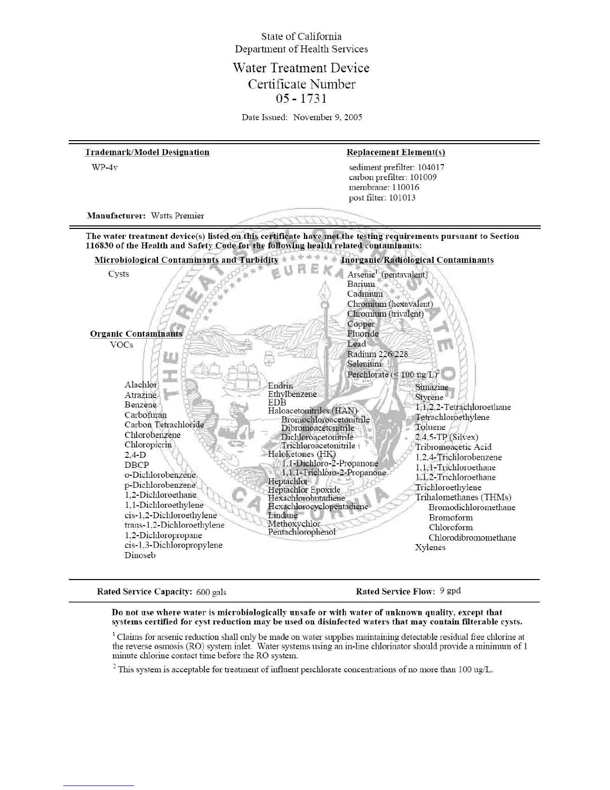 Watts Premier WP-4V - California Certification