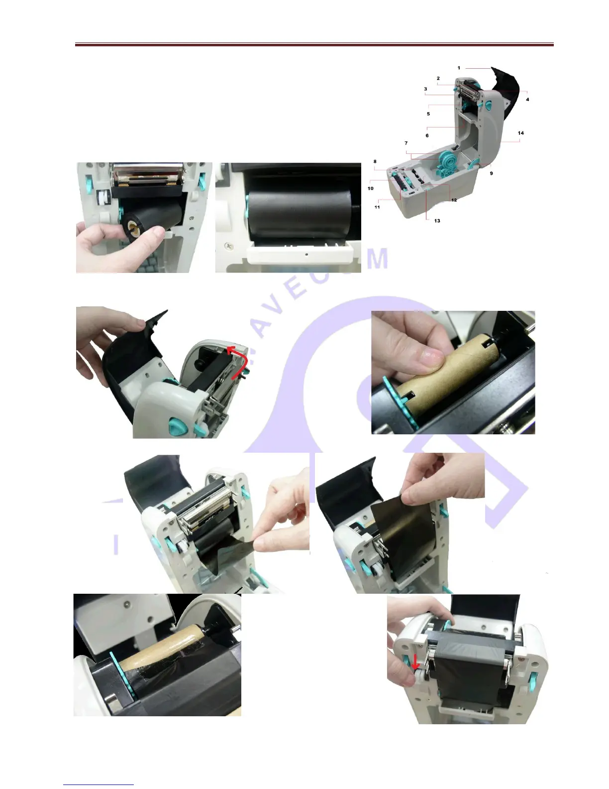 Insert the ribbon right side onto supply hub (5). Align the notches on the