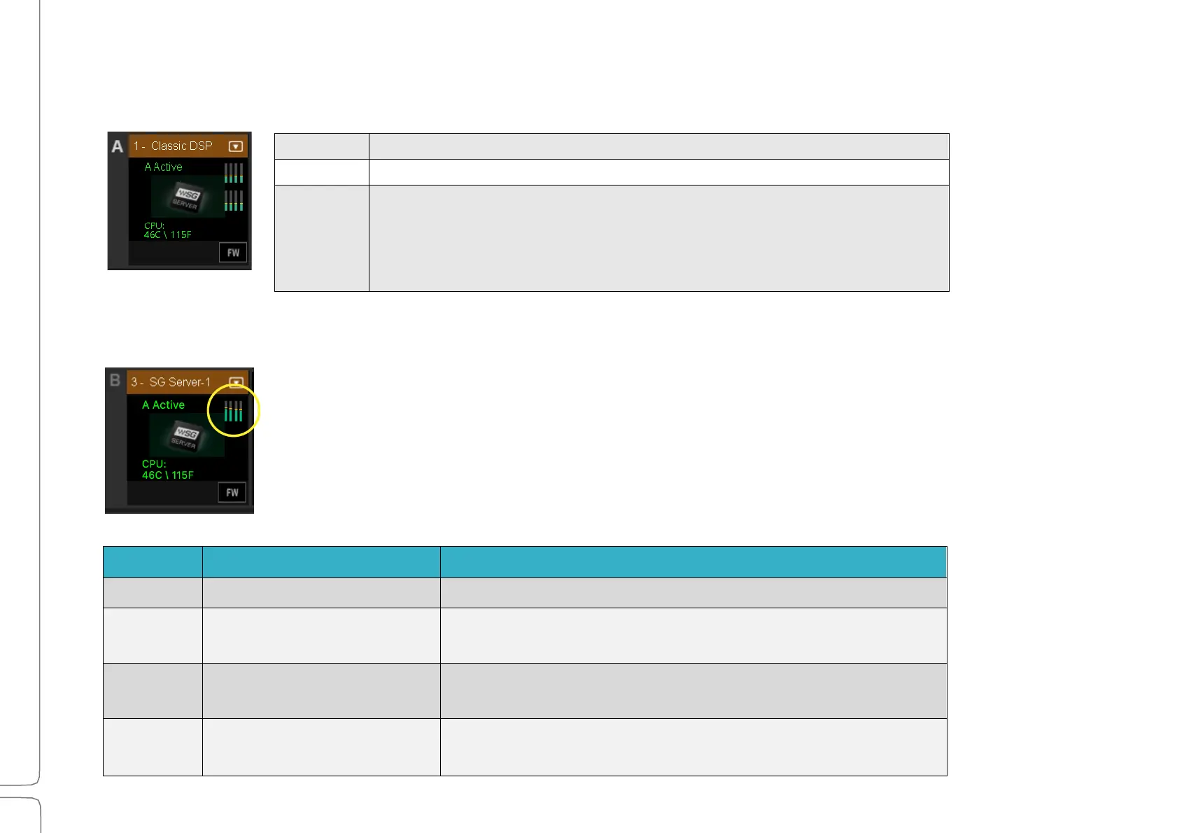 The meter bars on a server icon indicate DSP usage of each of the server’s cores. There is