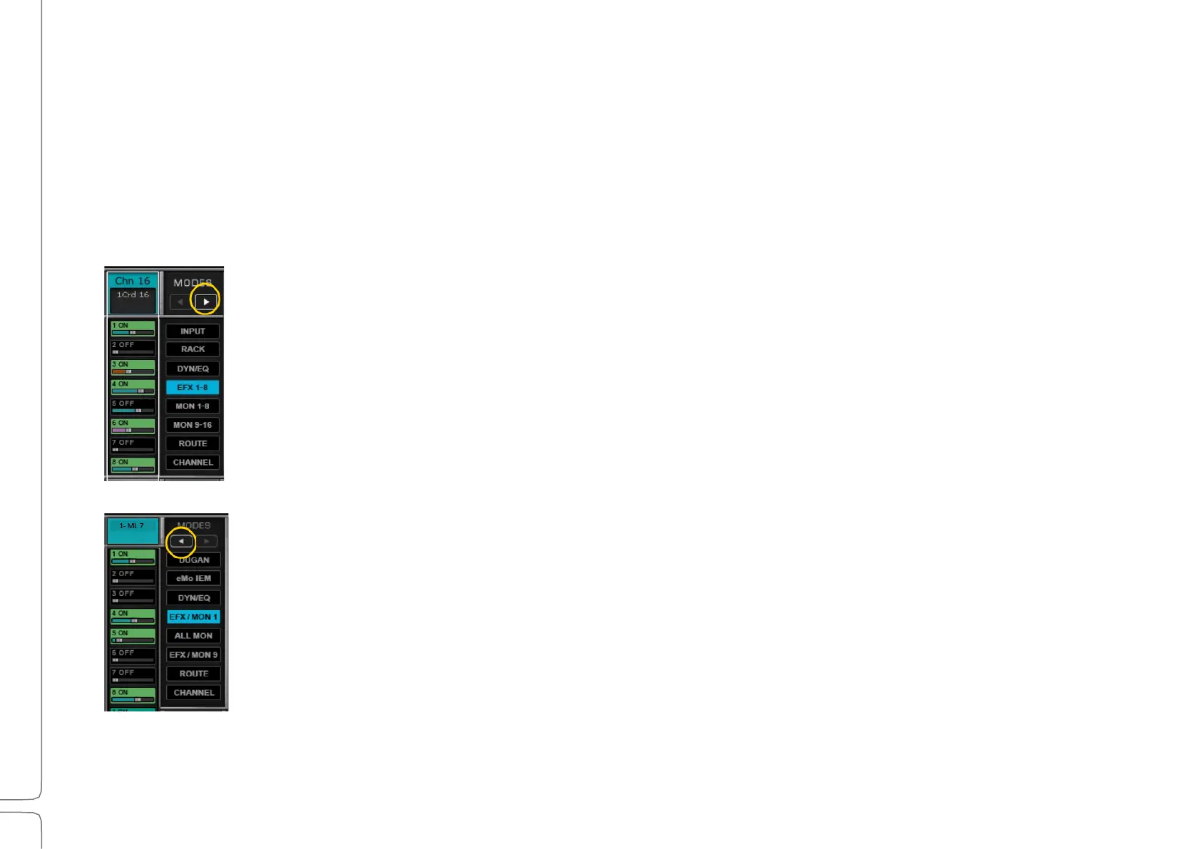 Displays 16 channels: EFX 1–8 and MON 9–16