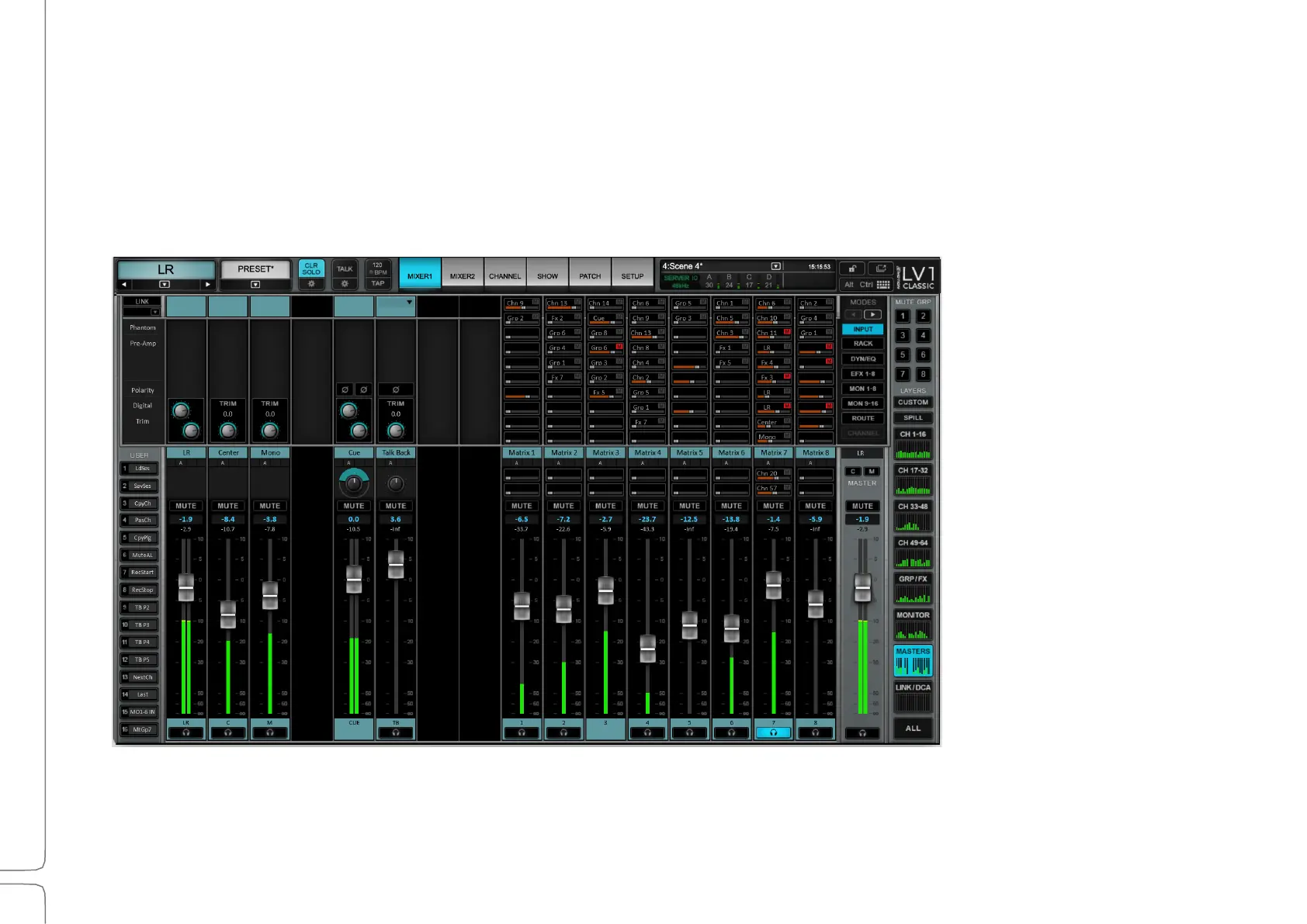 Talkback), and a Matrix (12 stereo inputs per channel, with eight stereo outputs).