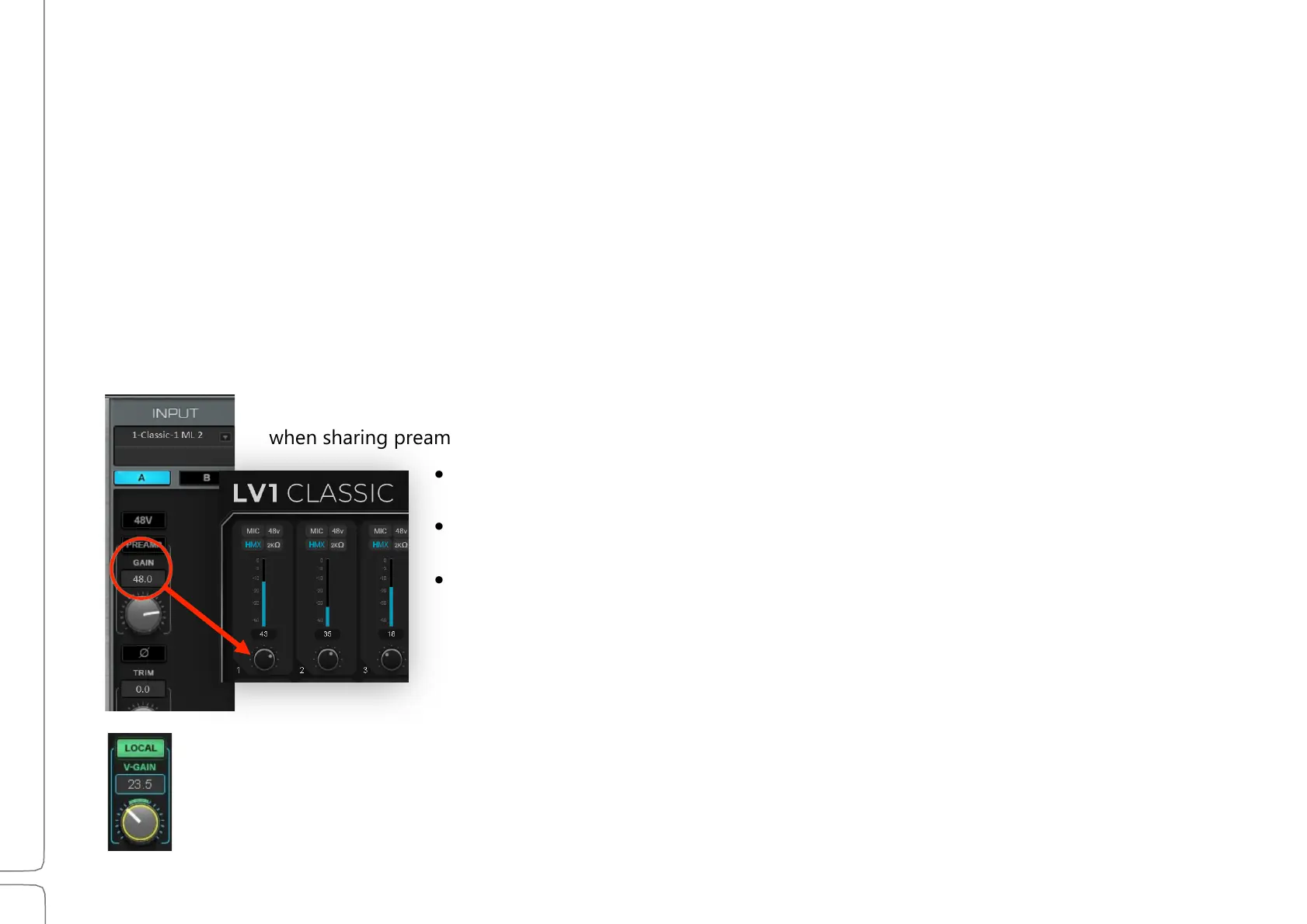 In Local mode, the Gain knob becomes the V-Gain knob (Virtual Gain). V-Gain is a digital gain stage that