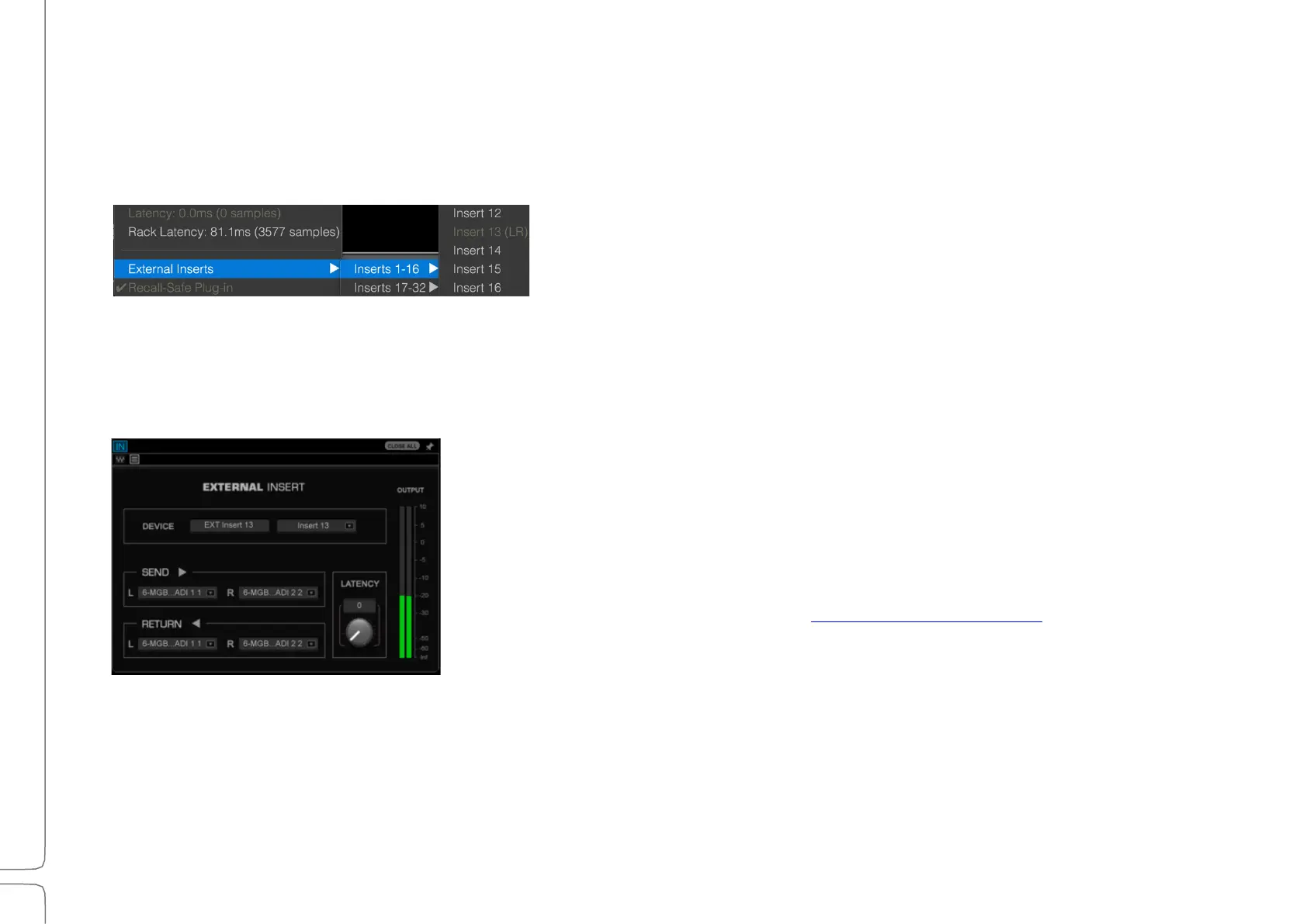 You can add external inserts to a plugin rack. An external insert follows the same routing path as plugins and can be moved up