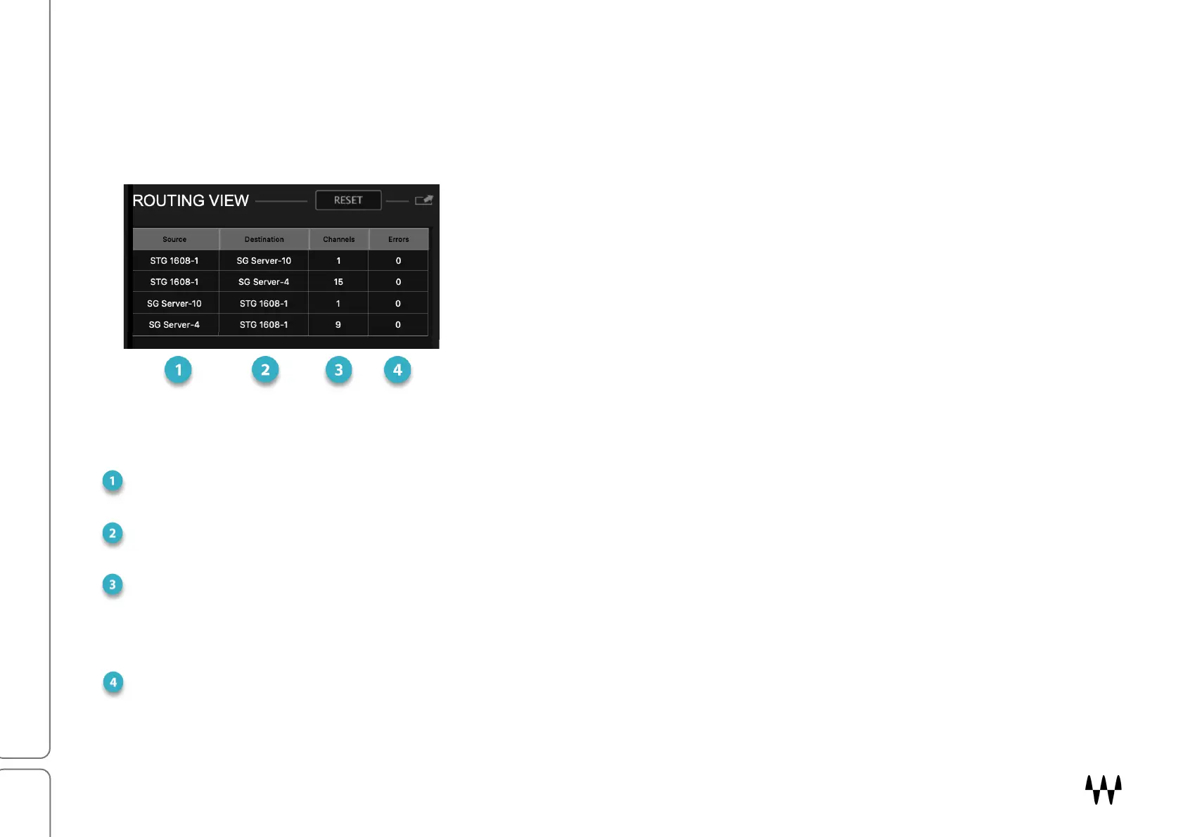 The Routing View panel shows the status of network connections. Each row represents a one-way patch between