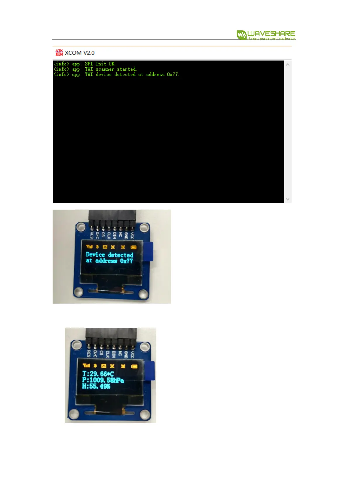 Downloading 007_I2C(BME280) codes, data will be printed to OLED as below: