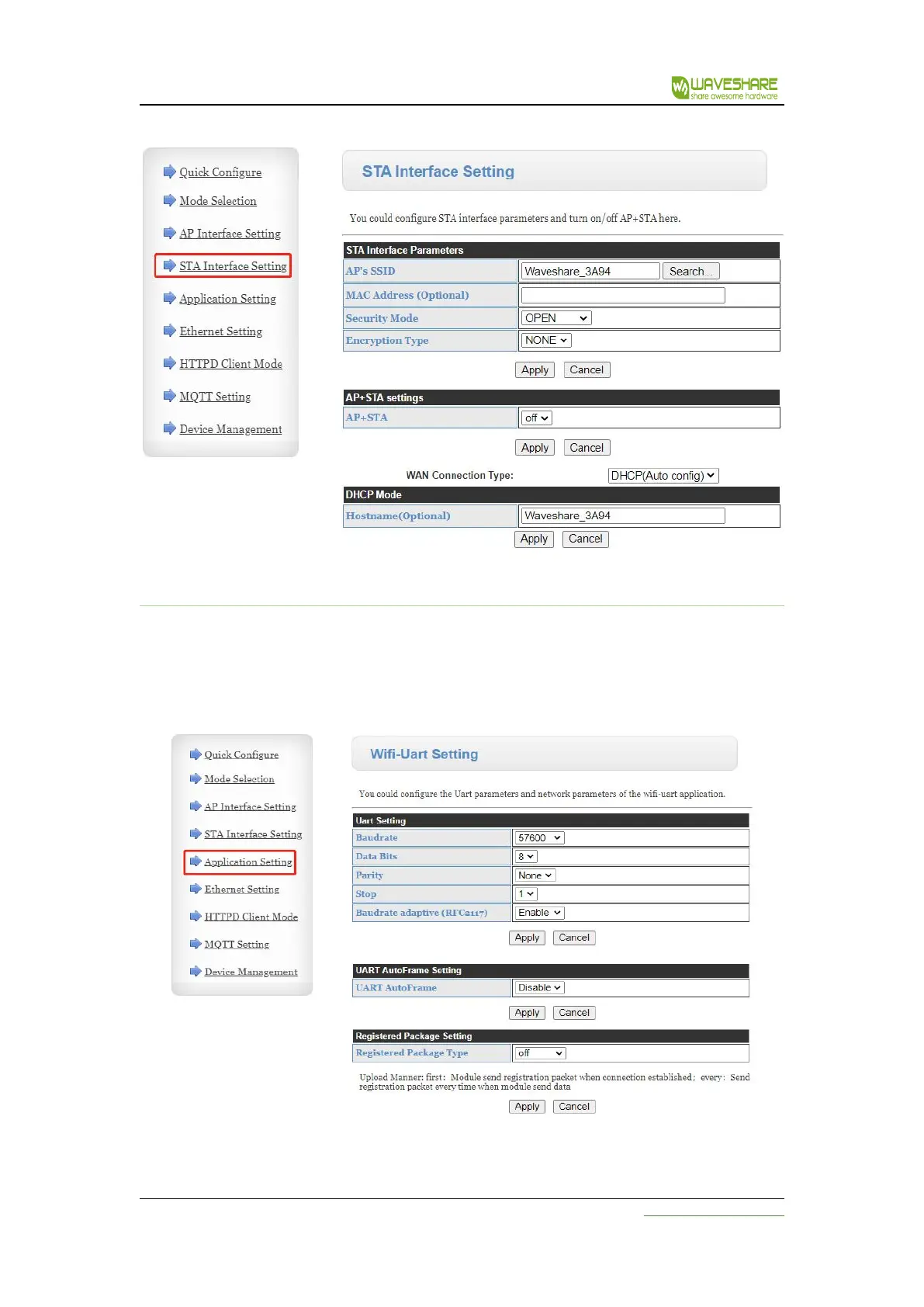 Application program settings refer to the settings of WIFI to serial port application parameters,