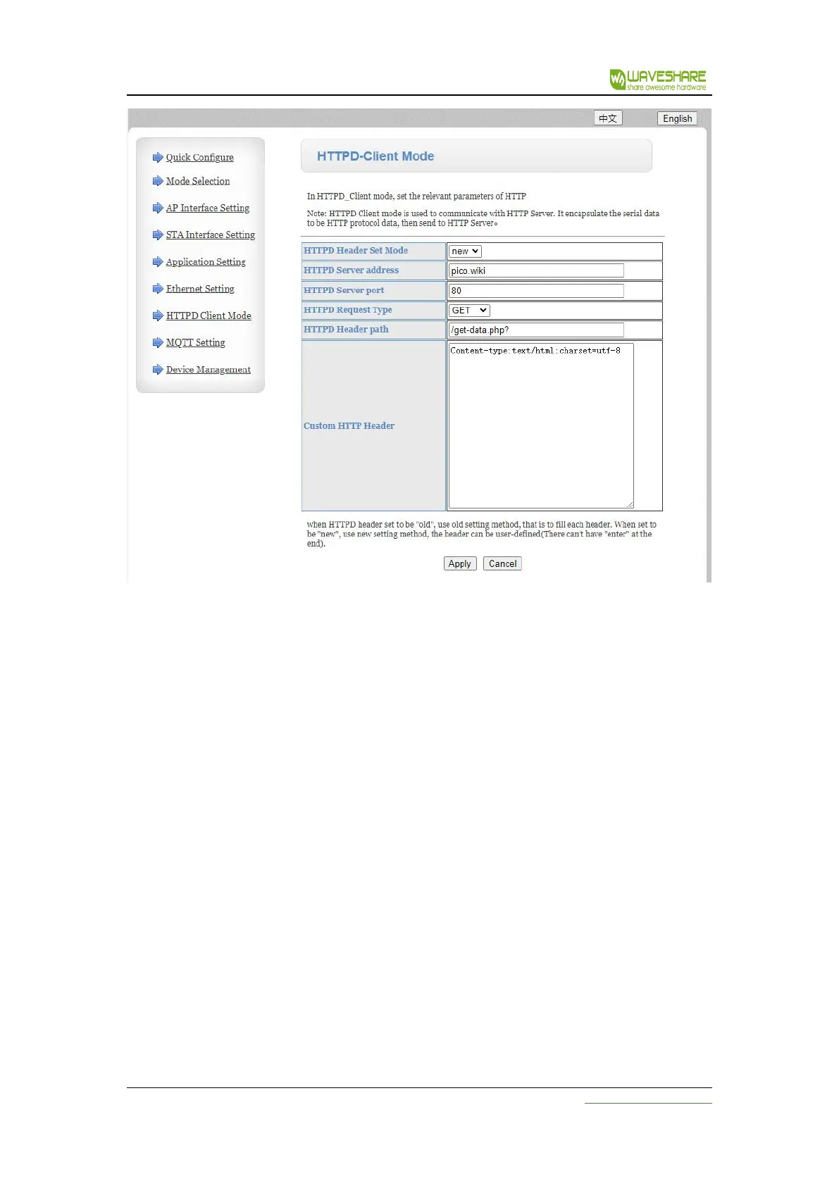 (2) Under the serial port and network configuration page, select the HTTPDClient mode as