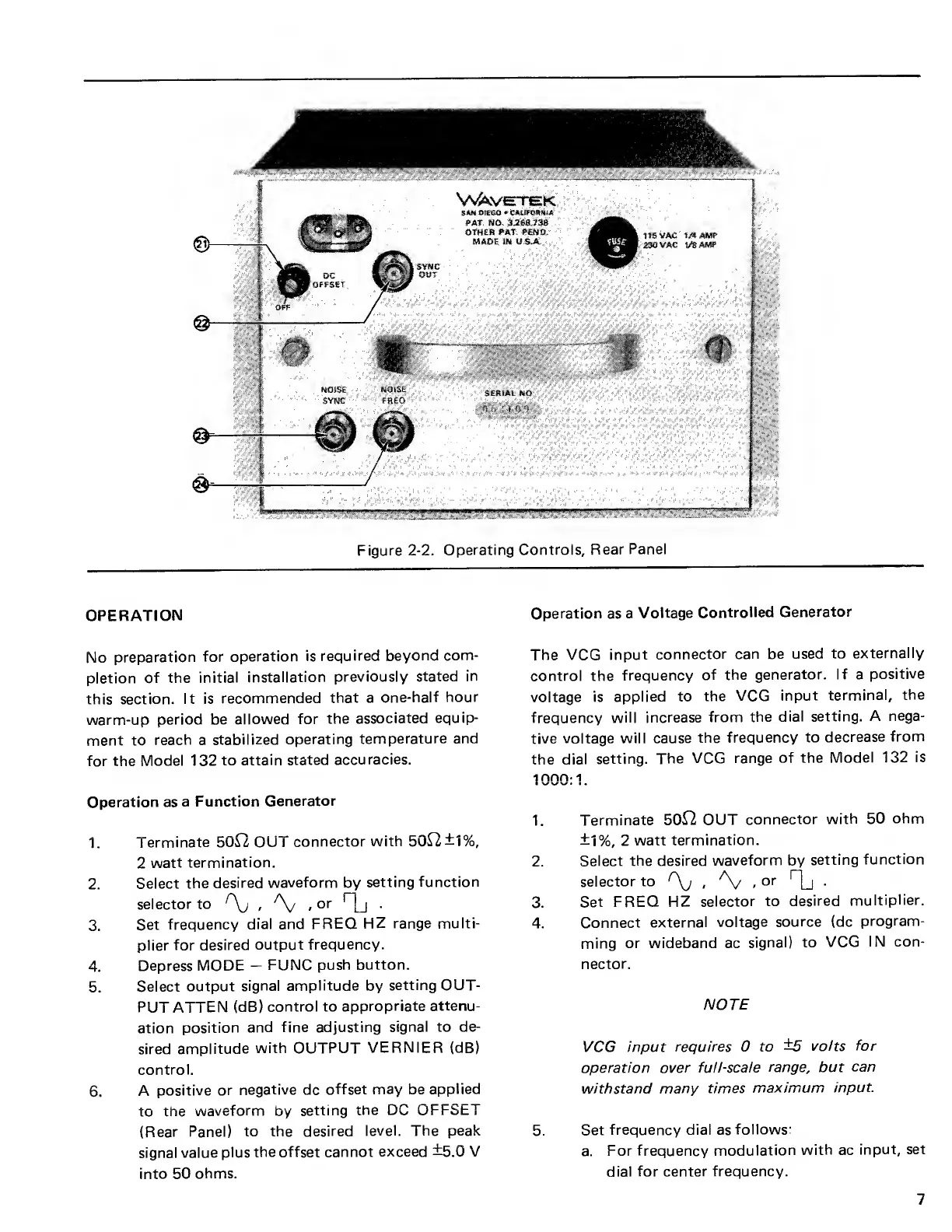 Wavetek 132 - Section 2 Operation - Modes; Function Generator Operation; Voltage Controlled Generator Operation