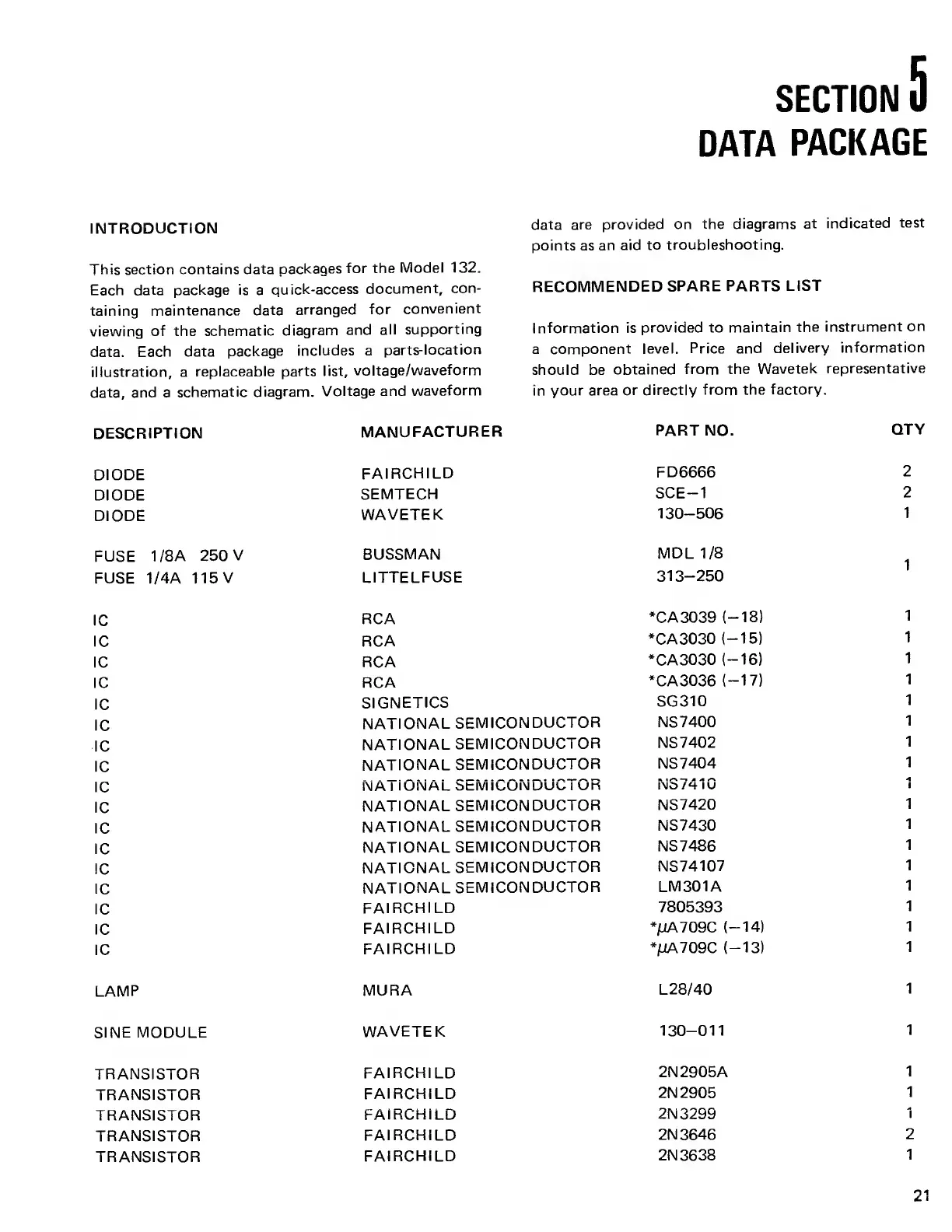 Wavetek 132 - Section 5 Data Package; Data Package Introduction; Recommended Spare Parts List