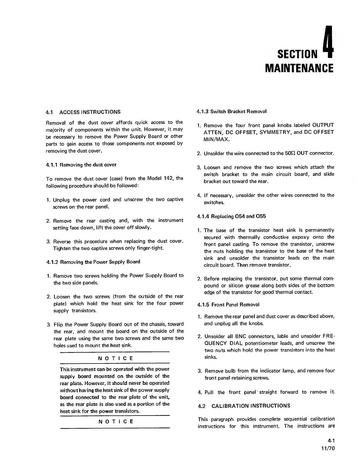 Wavetek 142 - Maintenance; Access Instructions; Calibration Instructions