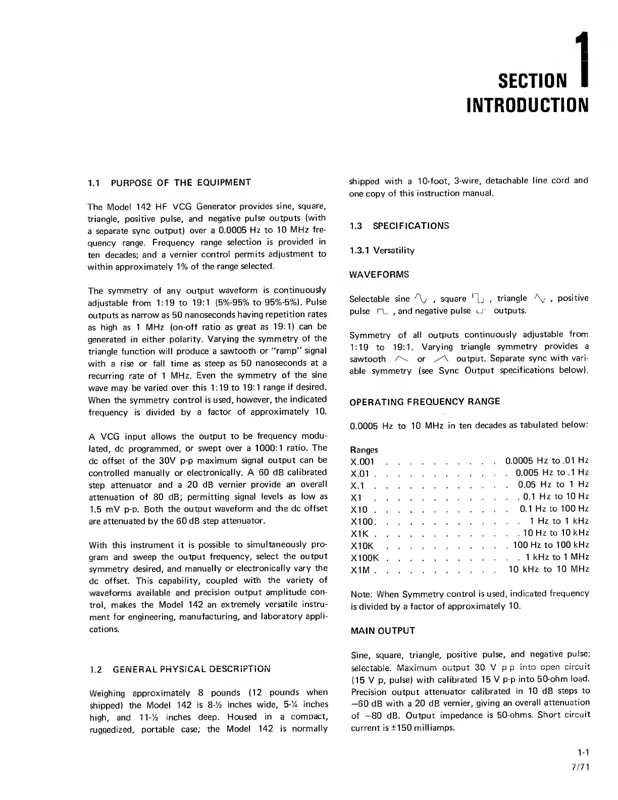 Wavetek 142 - Introduction; Purpose of the Equipment; Specifications