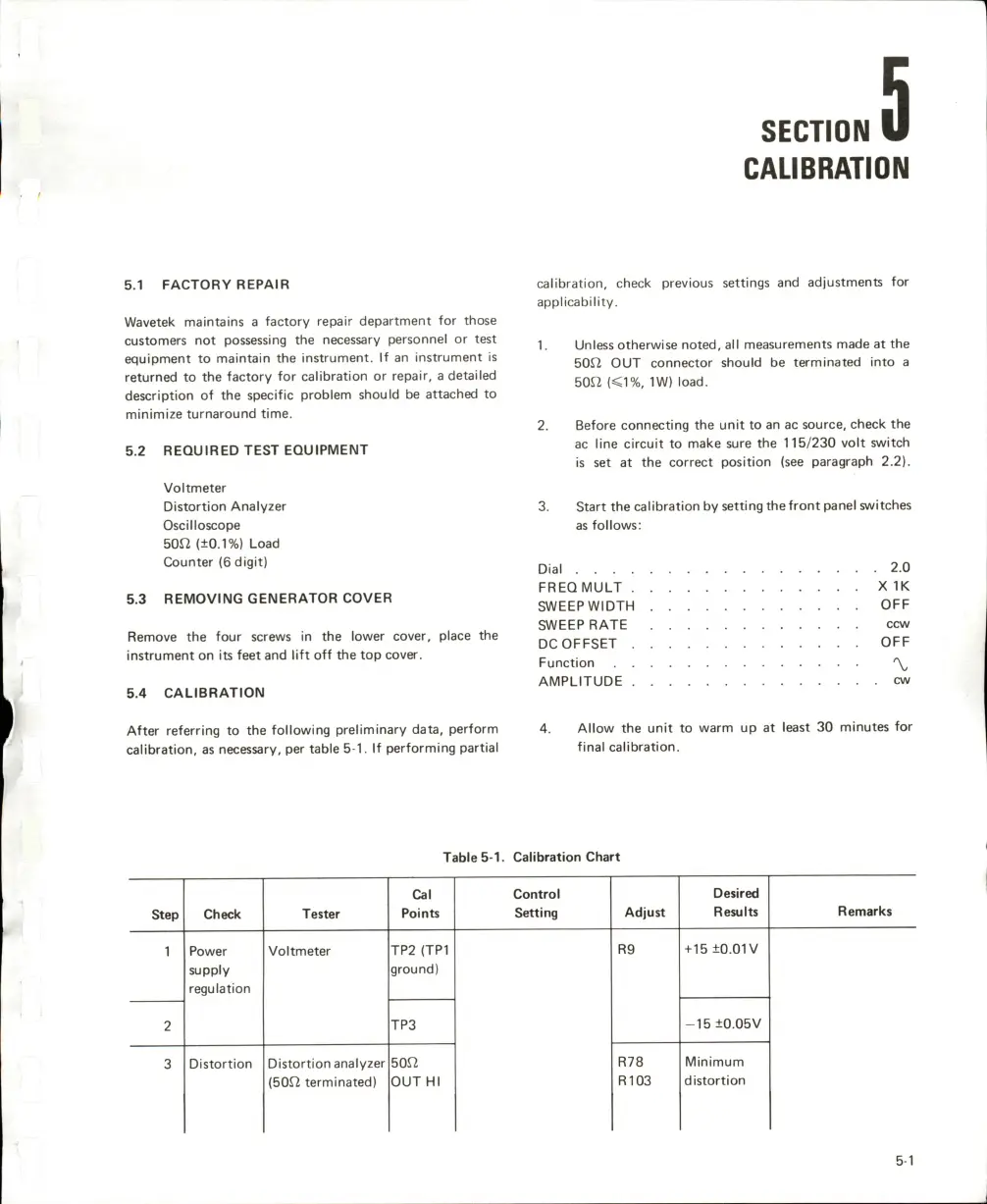 Wavetek 180 - Calibration; Factory Repair; Required Test Equipment; Removing Generator Cover