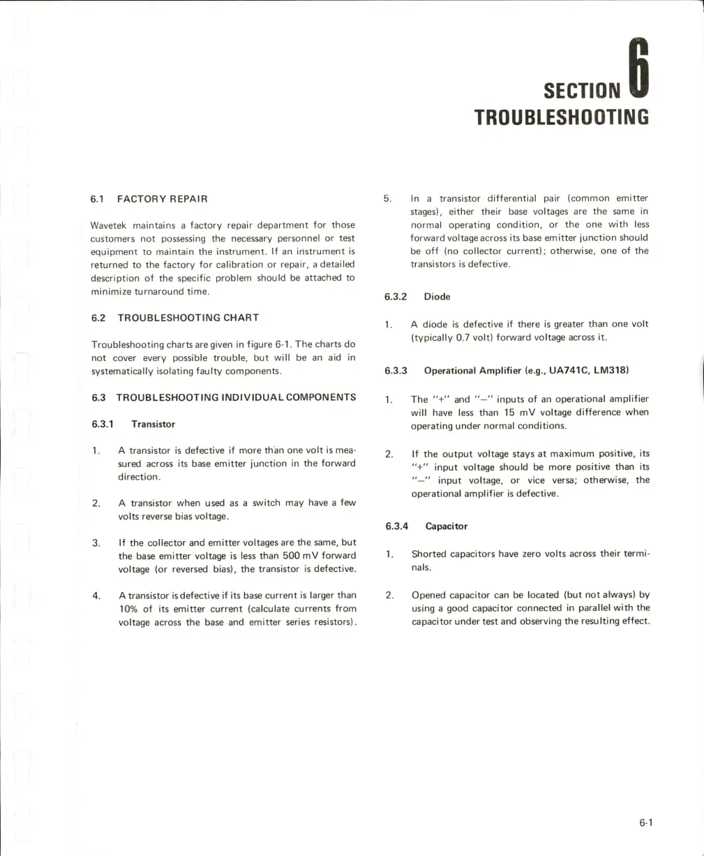 Wavetek 180 - Troubleshooting Chart; Troubleshooting Individual Components