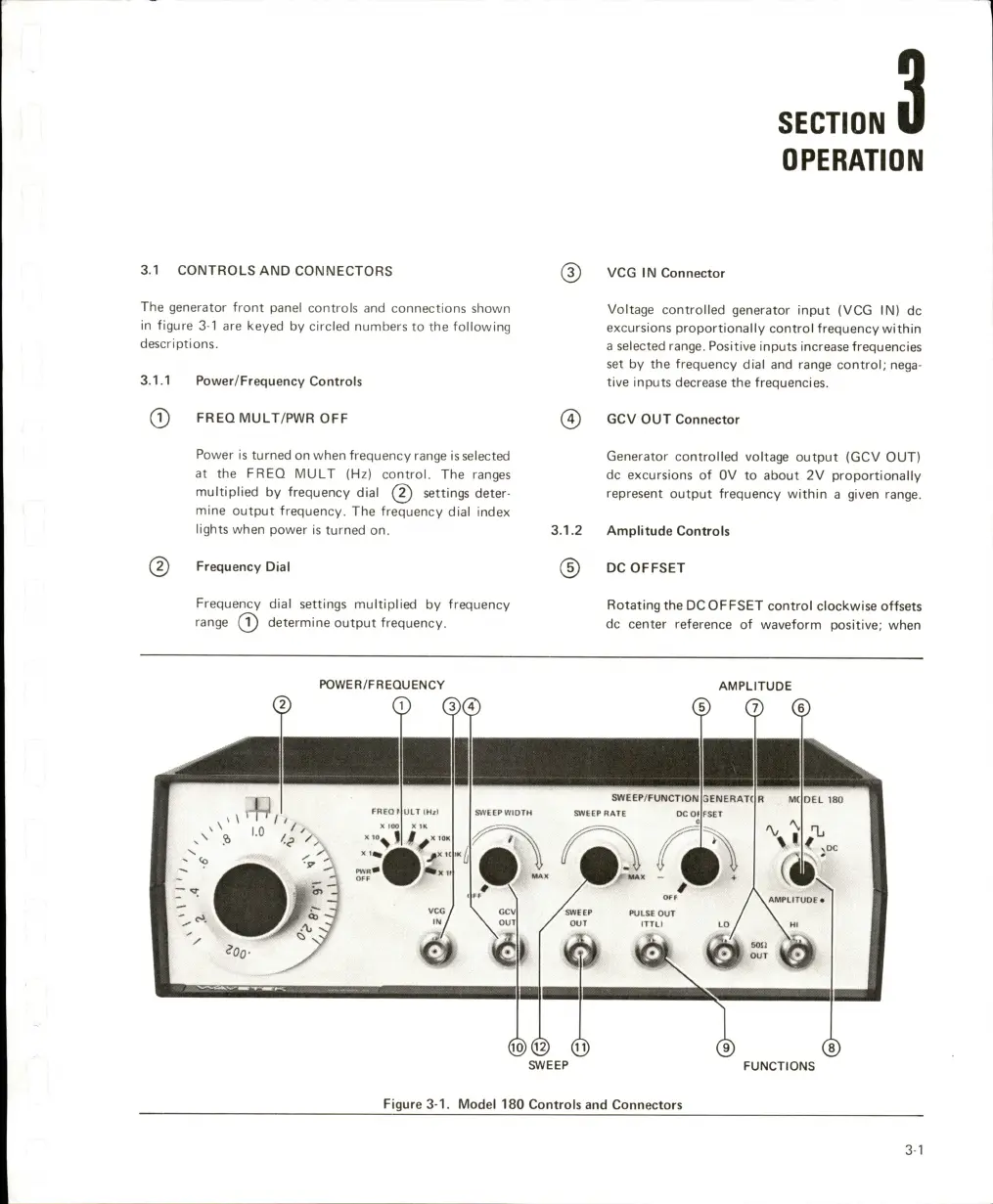 Wavetek 180 - Operation; Controls and Connectors; Power;Frequency Controls; Amplitude Controls