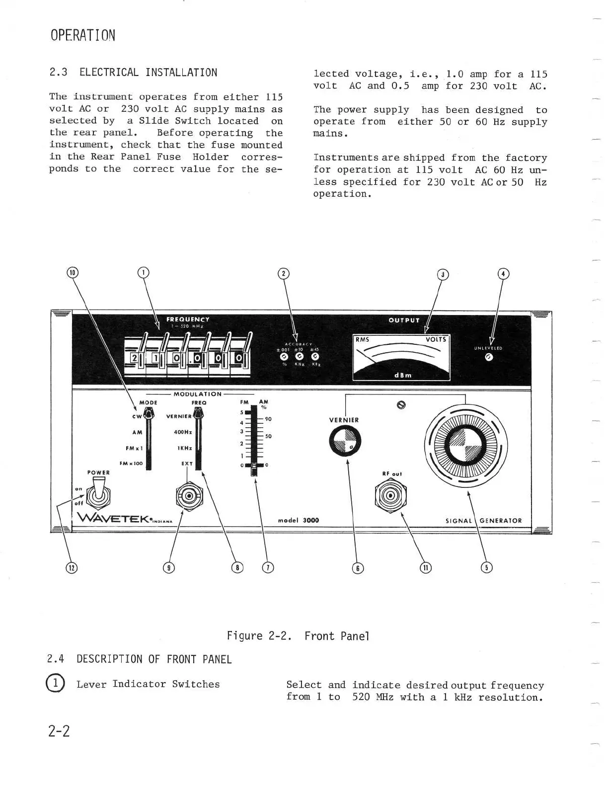 Wavetek 3000 - Electrical Installation; Front Panel Description